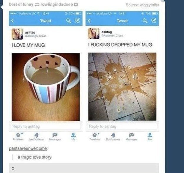 Un super gelato altro 30cm, la tua felicità nel fotografarlo, e poi cade per terra. Una coppia di fidanzati contenti e tu sullo sfondo, da solo, nella tua triste solitudine di ragazzo single. Una bilancia presa per controllarti i chili in eccesso, due secondi dopo per terra in mille pezzi: sarà mica un segno del destino? Così ancora come tazze alle quali tieni tanto, ma he si rompono in mille pezzi, il tempismo “perfetto” che rovina sempre i momenti migliori, la forchetta che userai per mangiare che invece ti cade nella salsa e per prenderla id nuovo devi sporcarti tutte le mani.