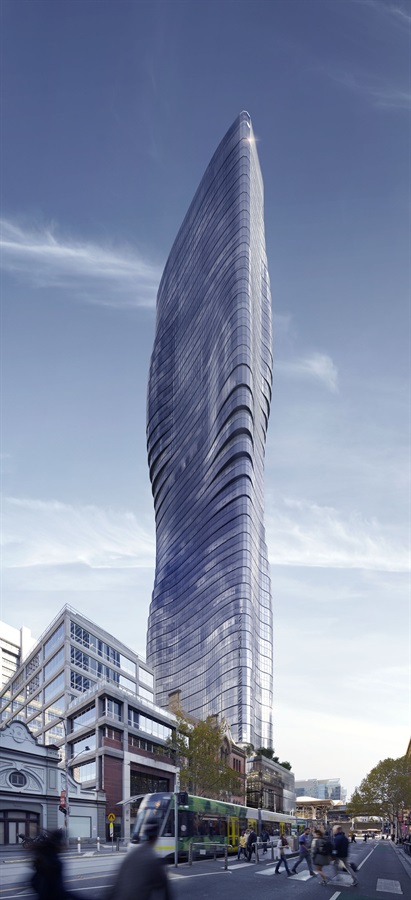 Lo studio di architetti Elenberg Fraser ha commentato così l’idea: “L’edifico sorgerà di fronte alla stazione centrale Southern Cross – si legge sul sito di design – e sarà la prima cosa che le persone vedranno una volta uscite sulla strada. La forma rende omaggio a qualcosa di ancora più estetico, vogliamo credere che abbiate visto il video del brano Ghost di Beyoncé. La fisionomia di questo nuovo edificio è pura e semplice, segue un principio razionale e rappresenta il culmine della nostra ricerca di cosa funzioni meglio in un ambiente abitato e che tenga conto dei limiti climatici. Il profilo del complesso è il modo più efficiente per distribuire la massa del grattacielo in termini strutturali, di oscillazioni e necessità dettate dal vento”.