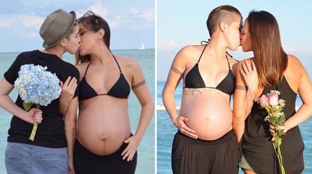 Le foto che hanno fatto impazzire il mondo sono state scattate a distanza di circa un anno l’una dall’altra. Nella prima sono ritratte le due donne quando ad essere incinta era Vanessa Iris. Nella seconda a mostrare il pancione è invece Melanie e, a fare da guardia alle due mamme, c’è il piccolo Jax.