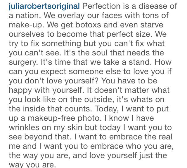 Julia Roberts si mostra ai suoi follower, e al mondo intero, con una foto senza make-up, con le rughe sul volto, come dice lei stessa, ma felice e contenta di quello che è.