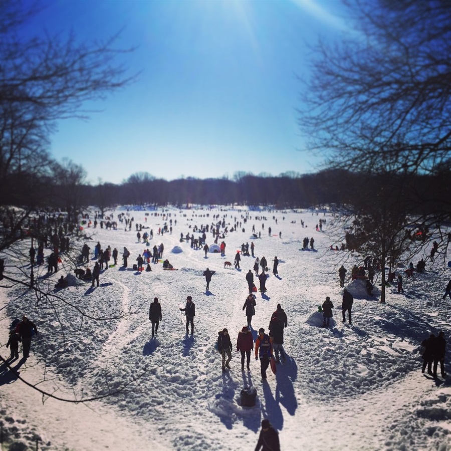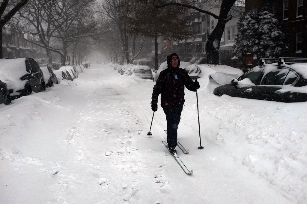 Il telegiornale ha mostrato gli abitanti di Manhattan mentre passeggiano a Central Park e quelli di Brooklyn, i quali vanno addirittura a fare la spesa con gli scii.