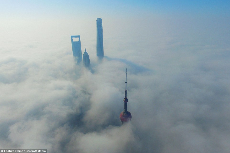Solo le cime dei grattacieli più alti di Shanghai erano visibili a occhio nudo, ieri, dopo la foschia scesa sulla città che ricopriva la maggior parte dei suoi edifici. In parte causa di tutto ciò è la coltre di smog in cui vive Shanghai, la metropoli inghiottita dalle polveri sottili. Un fotografo ha catturato alcune immagini aeree incredibili del World Financial Center, situato sulla costa orientale della Cina, asfissiato dal mal tempo.