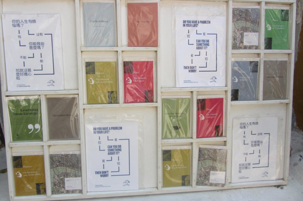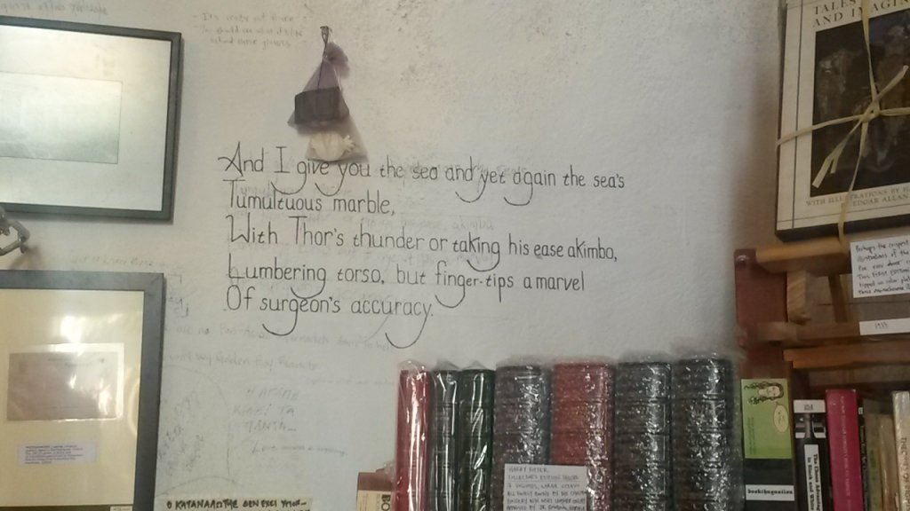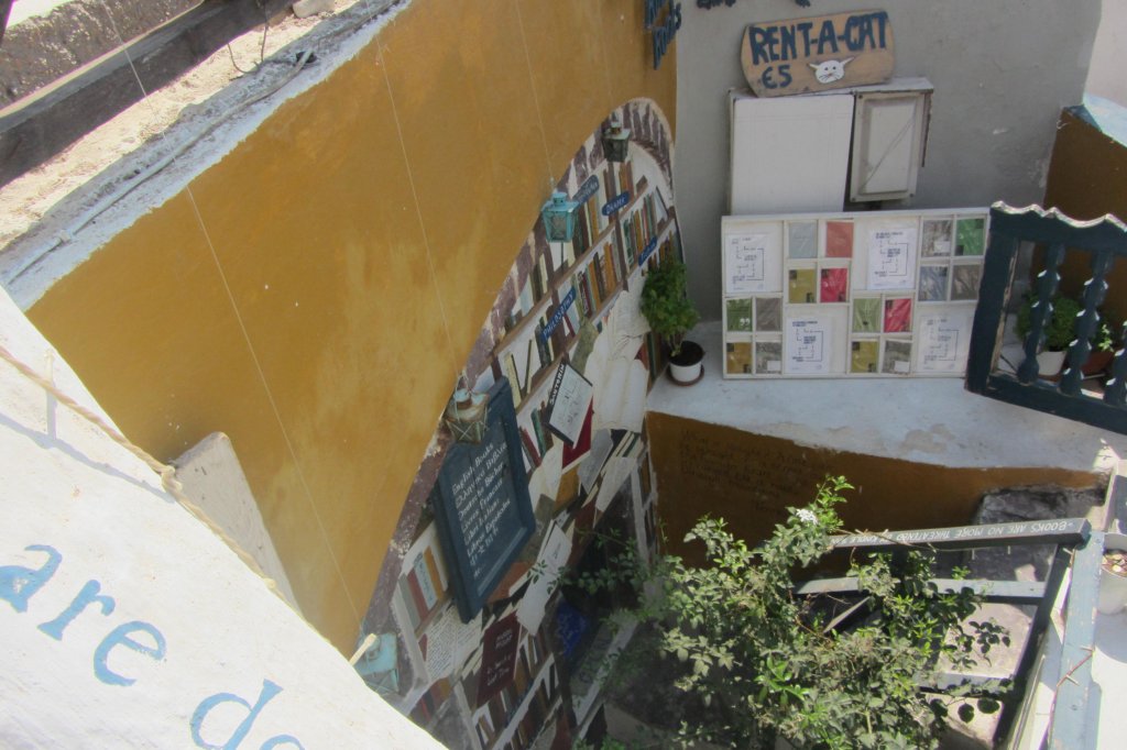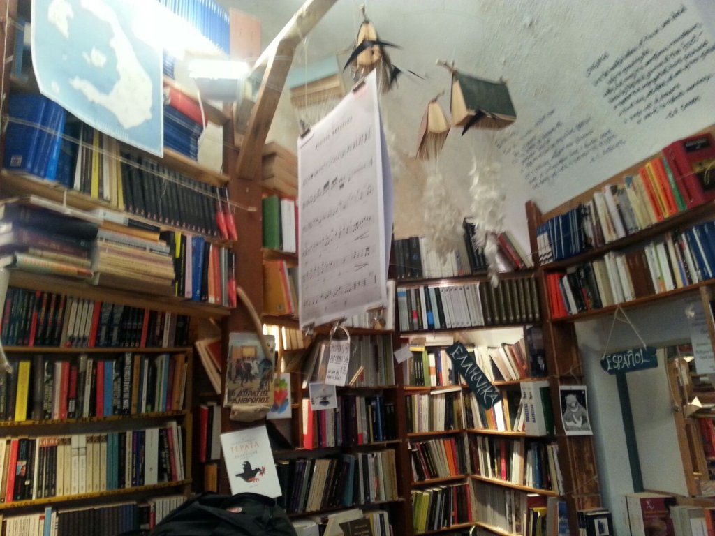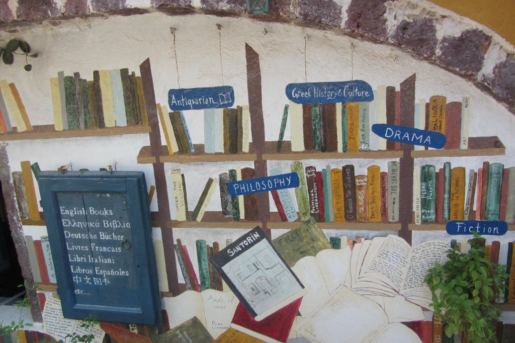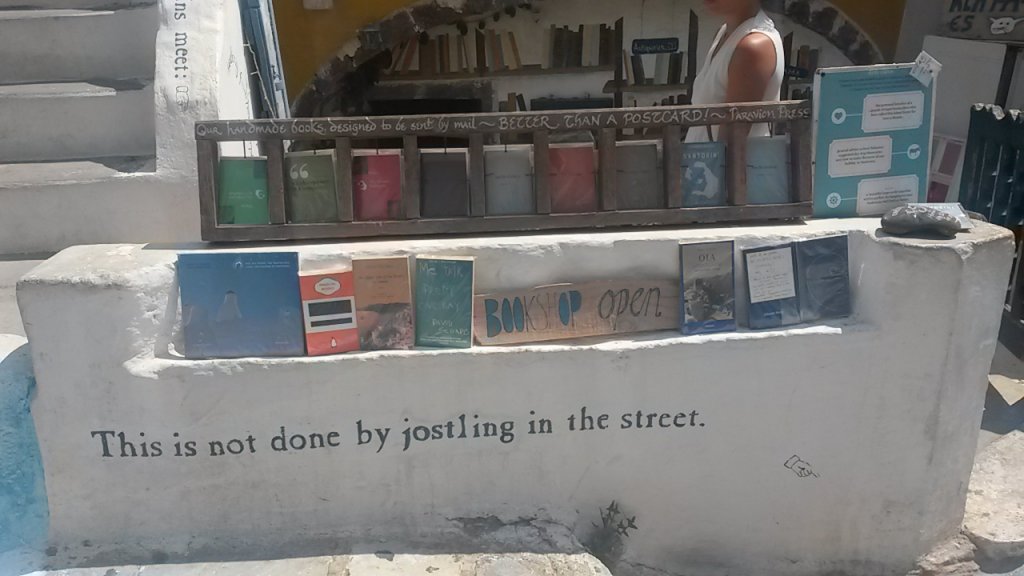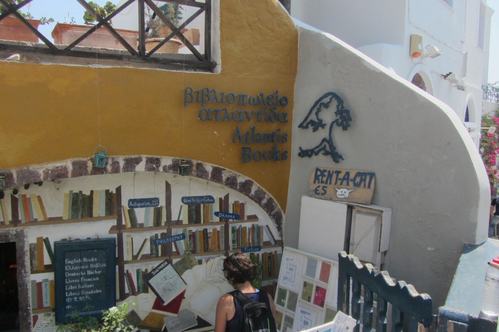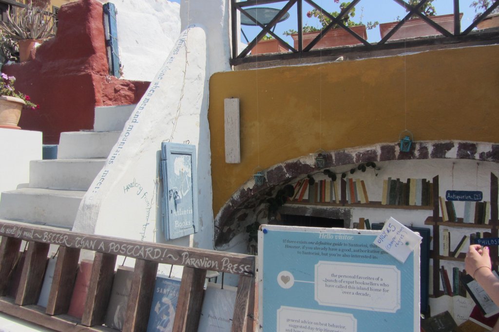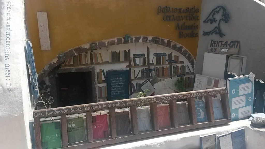 Scaffali con tantissimi libri, divisi per lingua e genere, da romanzi a poesie. Libri classici ed edizioni limitate sparsi tra i mobili e in ogni angolo possibile della piccola stanza che fa da libreria: sulle sedie, per terra e vicino alla cassa. Ma non solo libri: Atlantis Books vende anche cartoline ed agende – con foto di Santorini – stampe d’epoca, opuscoli stampati a mano. Il tutto, ovviamente, con frasi celebri che fanno venire i brividi agli amanti dei libri e dei viaggi.